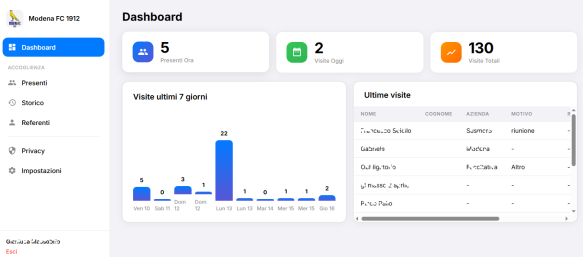 Mettiamo a disposizione export CSV automatici e, su richiesta, integrazioni API per sincronizzare visite e presenze con i vostri sistemi HR o di controllo accessi.